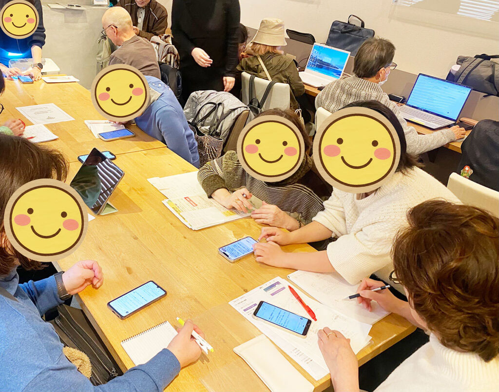 当日は、スマートフォンの操作が得意な学生がサポートとして参加し、参加者一人ひとりに寄り添いながら、操作のお手伝いをしました。
